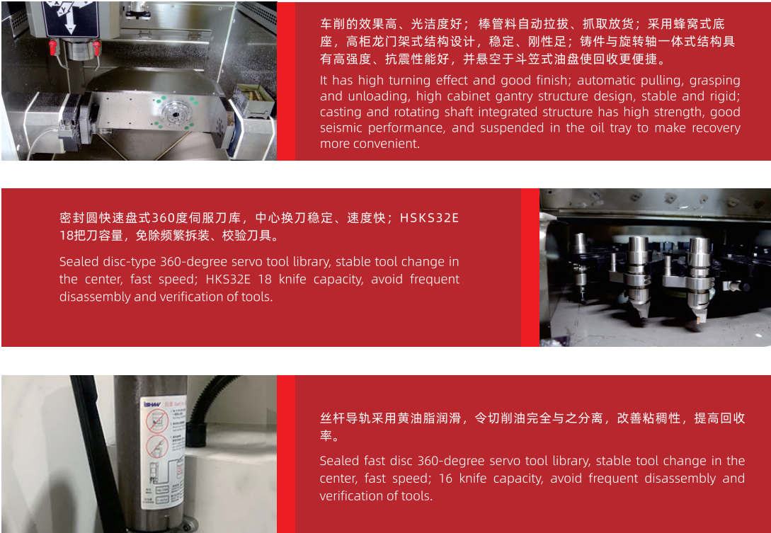 集五軸立體空間雕刻帶車削于一體;車削 的效果高、光潔度好;棒管料自動拉拔、 抓取放貨, 一次性完成整根棒料的生產, 省時省工;滿足各種弧度擺動類產品需求。