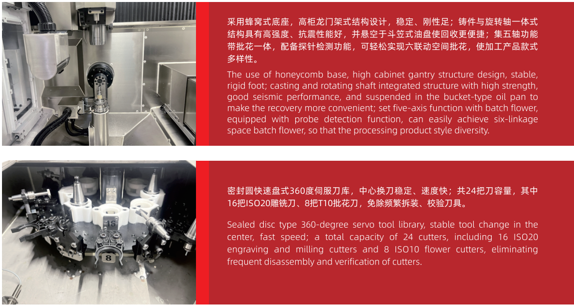 專業(yè)首飾批花機(jī)型,集五軸功能帶批花 一 體;可輕松實(shí)現(xiàn)六聯(lián)動(dòng)空間批花, 替代傳統(tǒng)人工批花,傳統(tǒng)工藝上難加工 的螺旋紋、米字花、太陽紋等多樣批花 款式;滿足各種弧度擺動(dòng)類產(chǎn)品需求, 并配備有中心鏡校驗(yàn)中心點(diǎn)探測(cè)功能 大大降低廢品率操作更便捷。